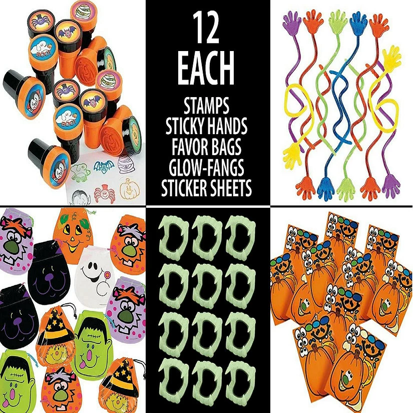 Spread the Halloween spirit with this 60 Piece Halloween Kids Toy Assortment Kit. The set includes: 12 Halloween stamps, 12 glow in the dark fangs, 12 sticky hands, 12 make your own pumpkin stickers, and 12 Halloween draw string goody bags. The goody bags are not pre-filled and are in random assortments of: pumkpins, ghosts, witches, Frankenstein, black cats & monsters. Fun set to give out to friends, family, or trick-or-treaters.