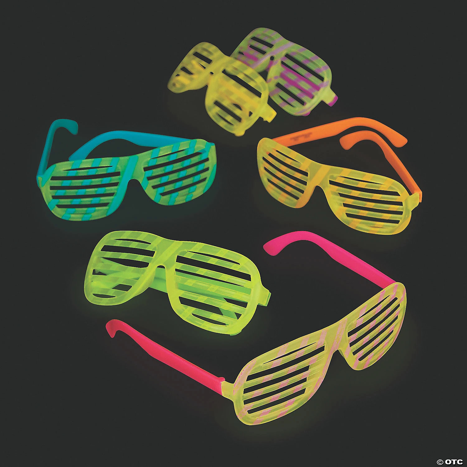 • Let’s Cosplay: Go retro with these 80s-inspired shutter glasses that glow in the dark.• Great Design: Set includes 12 novelty glasses in a variety of glow-in-the-dark colors. Each is 6” with 5 ½” ear pieces. Expose items to daylight to activate glow. • Excellent Quality: The plastic glasses have a shutter style look and are for novelty use only.• Fun for Any Event: Hand out these shades at your 80s-themed event or bachelorette party.Product Description: The 80’s called, they want their cool glow-in-the-dark shutter glasses back. You get a dozen 80s cosplay shutter glasses in assorted glow-in-the-dark colors. Just expose them to daylight to activate the glow. Tuck the shutter shades into treat bags or give them out as party favors. For novelty use only. Size: 6” with 5 ½” ear piecesQuantity: 12Material: PlasticBrand: © OTC – Oriental Trading Company