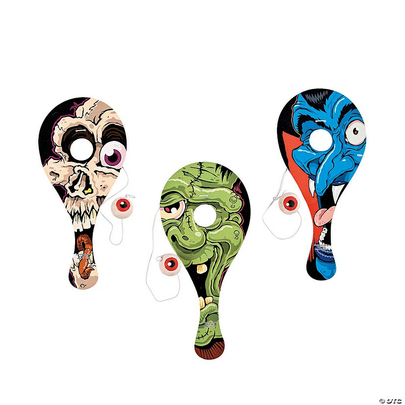 These ghoulish paddleball games are sure to challenge your hand-eye coordination! Halloween toys that make great costume party games, they’re also perfect trick-or-treat handouts and fall festival carnival prizes. To play, try and flip the eyeball-shaped ball into each ghoul’s eye socket. Wood with a 1″ rubber ball. 9″ ยฉ OTC