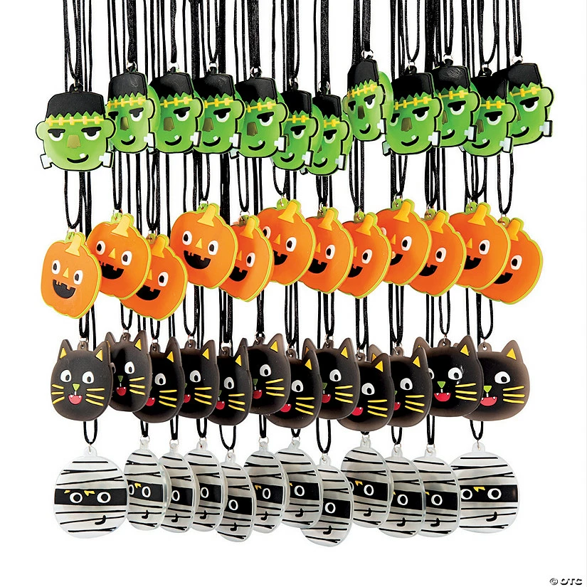 Make fright night bright with these friendly Light-Up Halloween Necklaces! They’re festive accessories for Halloween party favors or as candy-alternative Halloween treats for trick-or-treaters. Each necklace has a charm featuring friendly monsters, black cats and more. Great for trunk-or-treat giveaways, too! Rubber. (4 dozen per unit) Each 2″ pendant is on a 24″ breakaway cord. Includes batteries.