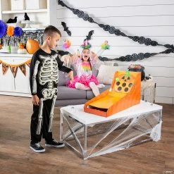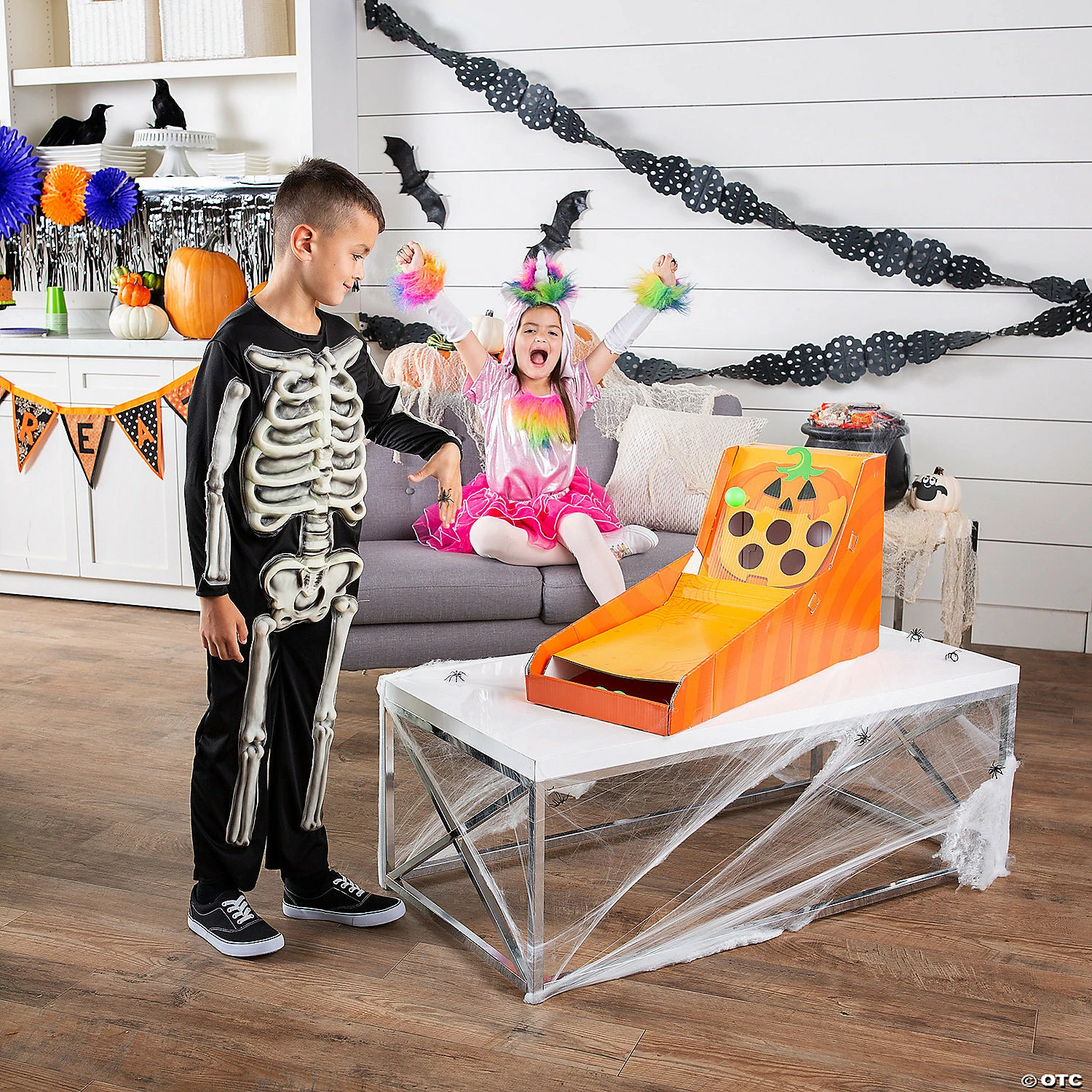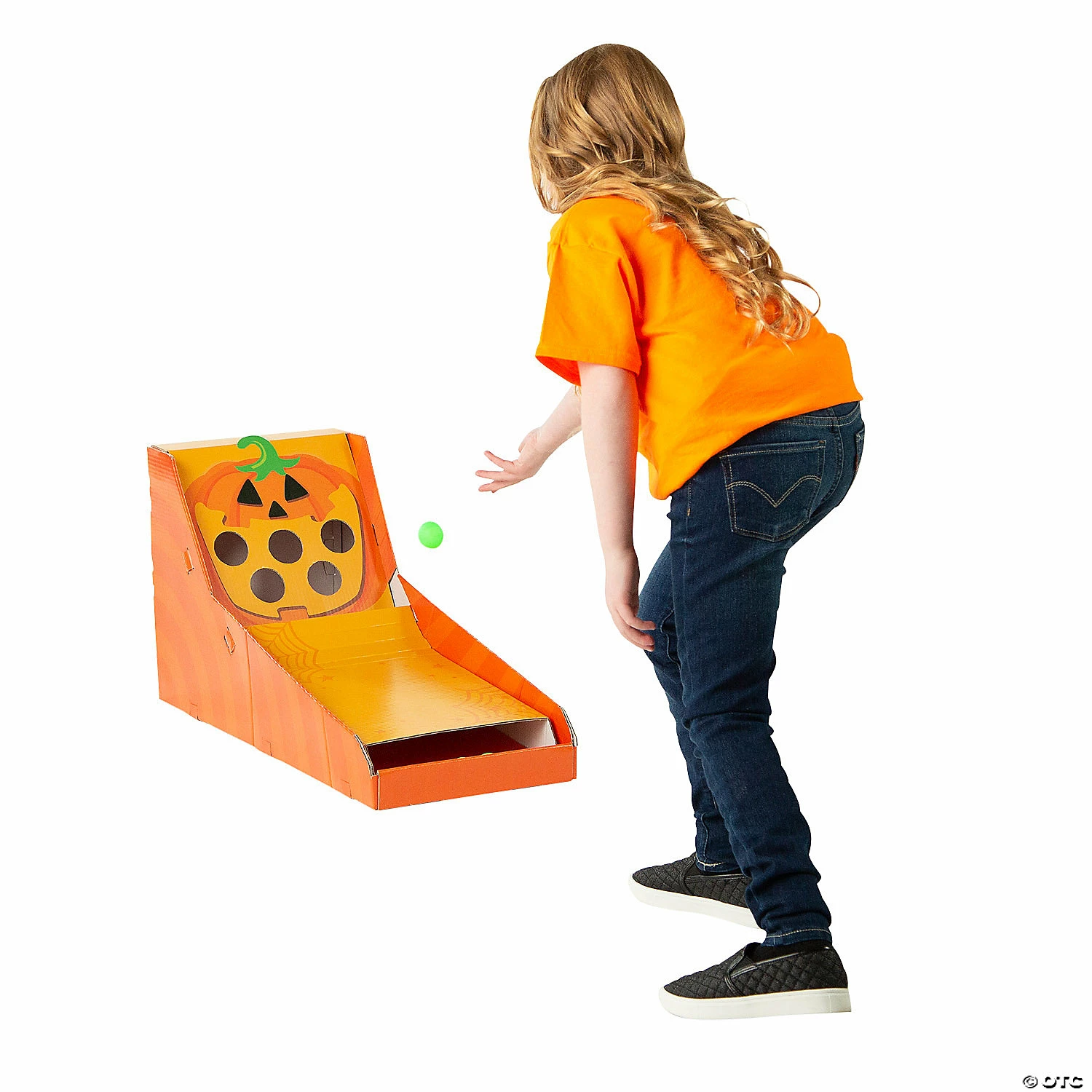 Hereโs a fun game that most people already know how to play thanks to carnivals and arcades: ball rolling! This Halloween game is great for a classroom party, a party at home or as an activity at a Halloween carnival or Harvest Festival. Players try to land as many balls as they can into the holes of the smiling jack-o-lantern. Be sure to check out all the fun Halloween treats and prizes here on this website that you can add to make the game even more fun. Cardboard. (5 pcs. per unit) 30″ x 15 1/2″ with four plastic balls. Simple assembly required.