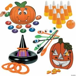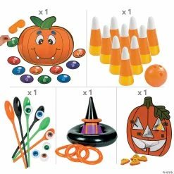 Who says trick-or-treating is the best part of Halloween? Game time can be the best part of your kids’ day with these fun Halloween games! Perfect for kids’ Halloween parties or for some fun family time on the spookiest day of the year, these games will keep kids laughing! Ring toss, bowling and more are included in this fun kit that will make game time the best time of Halloween! (5 pcs. per unit) Assortment may vary.Includes:• 1 Inflatable Witch Hat Ring Toss Halloween Game (Includes four 10″ rings and one approx. 20″ x 24″ witch hat, inflated.)• 6-Pc. Jack-O’-Lantern Bean Bag Toss Game (Includes five 3″ candy corn bean bags, one 19″ x 15 3/4″ wooden board and a 20″ pole for standing.• 1 Plastic Halloween Spoon Game (12 pcs. per unit. Includes 2 spoons each of 3 colors and 6 eyeballs. Spoons, 11 1/2″; balls, 1 1/2″)• 1 Paper Silly Pin the Nose on the Pumpkin Game (Includes an 18″ pumpkin, 10 noses and 1 cardboard blindfold with elastic strap.)• 12-Pc. Plastic Fall Bowling Game (11 pcs. per set) Pins, 8 1/2″; ball, 4″.)