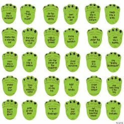 This fun twist on musical chairs is one in which everyone wins! Set out the foam feet in a circle, start up some fun tunes and walk, hop or skip from monster foot to monster foot until the music stops. Then look down at the foot you landed on, read off the instructions and perform the fun task, which could have you doing a monster dance, shaking like a scaredy cat or cackling like a witch. Whether you use this as a Halloween party activity, Physical Education game or family game night fun, one thingβs for sure: this active play activity will have everyone howling with laughter! Foam. (30 pcs. per unit) 6″ x 7 3/4″ Β© OTC