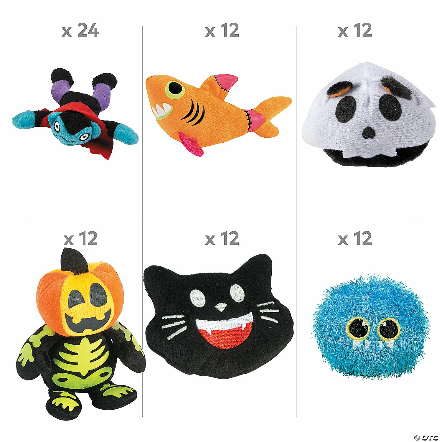 Stock up on fun Halloween giveaways for kids now so you donβt run out and find yourself on the business end of some tricks from trick-or-treaters! This impressive assortment is chock full of Halloween plush toys β perfect for handing out as prizes, giveaways or rewards for kids. Make up to six dozen little ghouls and boos happy on Halloween with these plush toys! (72 pcs. per unit) Assortment may vary.Includes:β’ 12 Halloween Silly Stuffed Cats in Ghost Costumes (3 1/4″)β’ 12 Halloween Patchwork Stuffed Zombie Sharks (5 1/2″)β’ 12 Halloween Plush Emojis (3 1/2″)β’ 24 Halloween Monsters Stuffed Character Assortment (4″ x 5″)β’ 12 Spookadelic Plush Characters (7″)β’ Assortments are subject to change at any time and may vary from picture shown. Substituted items will be similar in nature.
