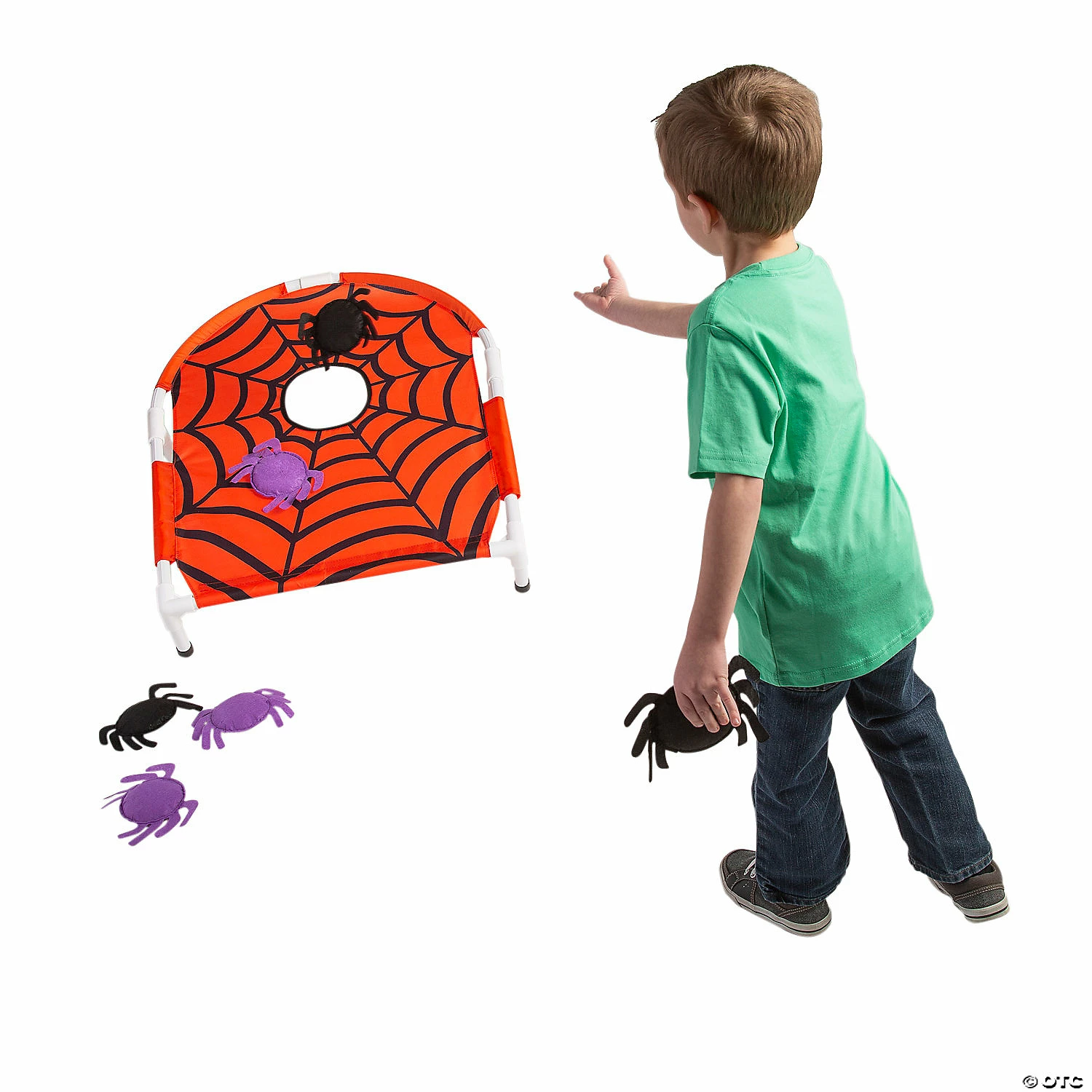 Family Halloween fun is easy with this fun cornhole game. Featuring a Halloween spider web design and spider-shaped bean bags, this not-so-spooky Halloween game is fun for all ages! Play in teams or one player versus another โ the one with the most bean bags landed in the hole is the winner. Plastic and polyester. (7 pcs. per set) Includes 24 3/4″ x 29″ game board and three 4″ x 4″ purple bean bags and three 4″ x 4″ black bean bags. Simple assembly required.