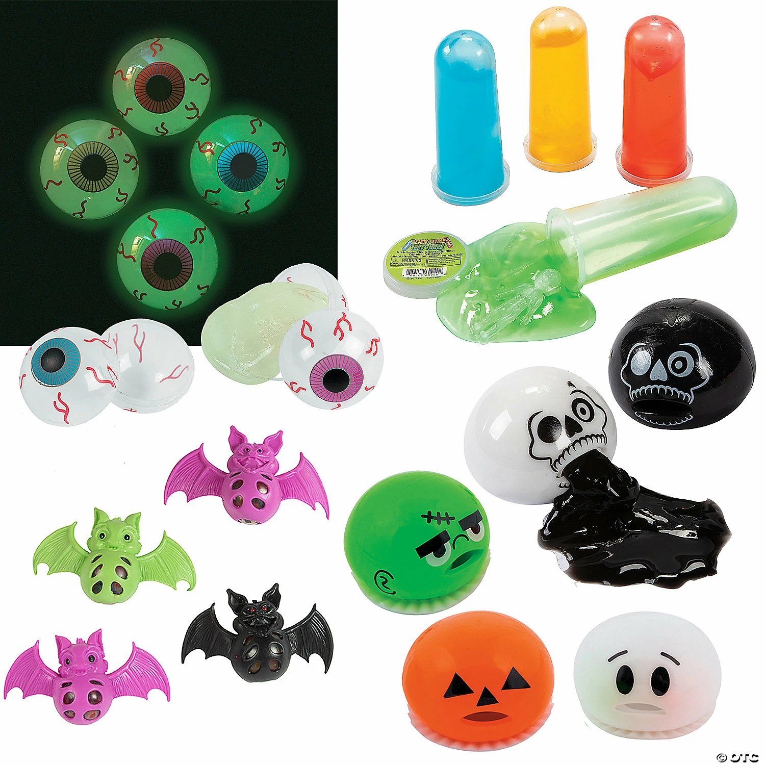 Kids love sticky stuff, especially during the Halloween season! Stock up on Halloween giveaways for kids with this helpful kit. Chock full of Halloween-themed slime and toys, this assortment of giveaways ensures you donβt run out of fun candy-alternatives for students, trick-or-treaters or young Halloween partygoers. (60 pcs. per unit) Assortment may vary.Includes:β’ 12 Plastic Glow-in-the-Dark Eyeball Slime (1 1/2′ diam. Expose items to daylight to activate glow.)β’ 12 Plastic Alien Test Tubes of Slime Containers (Each 3 3/4″ plastic container is filled with goo surrounding a 1 3/4″ alien.)β’ 12 Vinyl Halloween Character Slime Toys (1 1/2″ x 2″ diam. with 2-oz. bags of slime.)β’ 12 Vinyl Halloween Slime Sucker Skull Toys (2″ with 2-oz. bag of slime.)β’ 12 Vinyl Halloween Bat Water Bead Squeeze Toys (3″)β’ Assortments are subject to change at any time and may vary from picture shown. Substituted items will be similar in nature.
