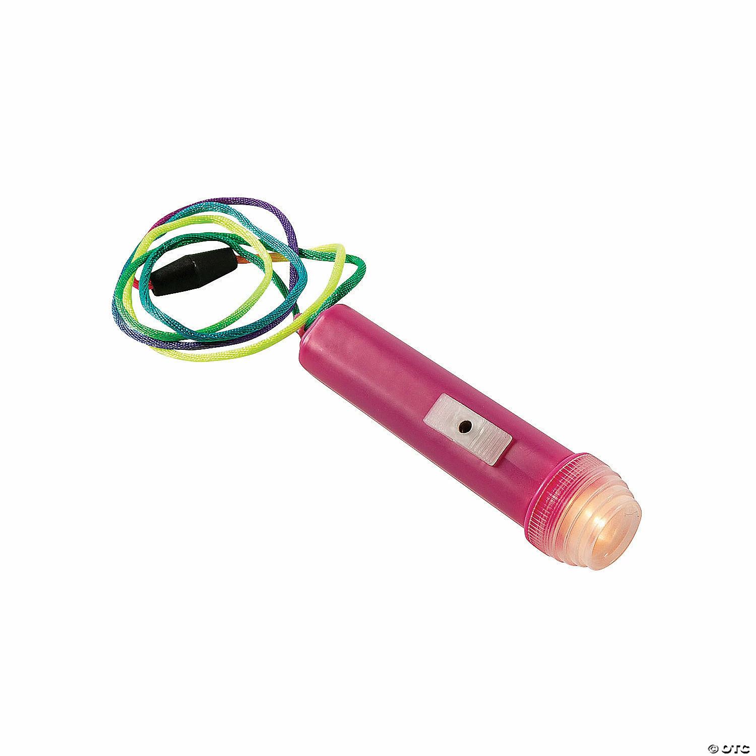 Keep a beam of light handy with these fun flashlights! A safe idea for outdoor nighttime play, each 3 1/2″ colorful plastic flashlight hangs on a 30″ rainbow cord. A must for your camping party favors, school camping trips and more! Each requires 1 “AA” battery, not included.